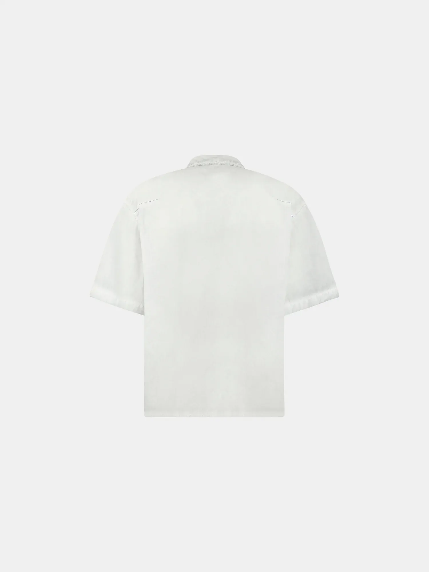 Relaxed-fit short-sleeve cotton shirt with angled front-panel seams at the shoulder.